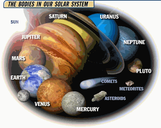 To the right is a picture of our solar system, and the bodies in it. Started by the sun, the planets are arranged in the following order in orbit: Sun, Mercury, Venus, Earth,Mars, Jupiter, Saturn, Uranus, Neptune, and Pluto... and at the bottom right there is a shot of a comet, meteorite, and asteroid.